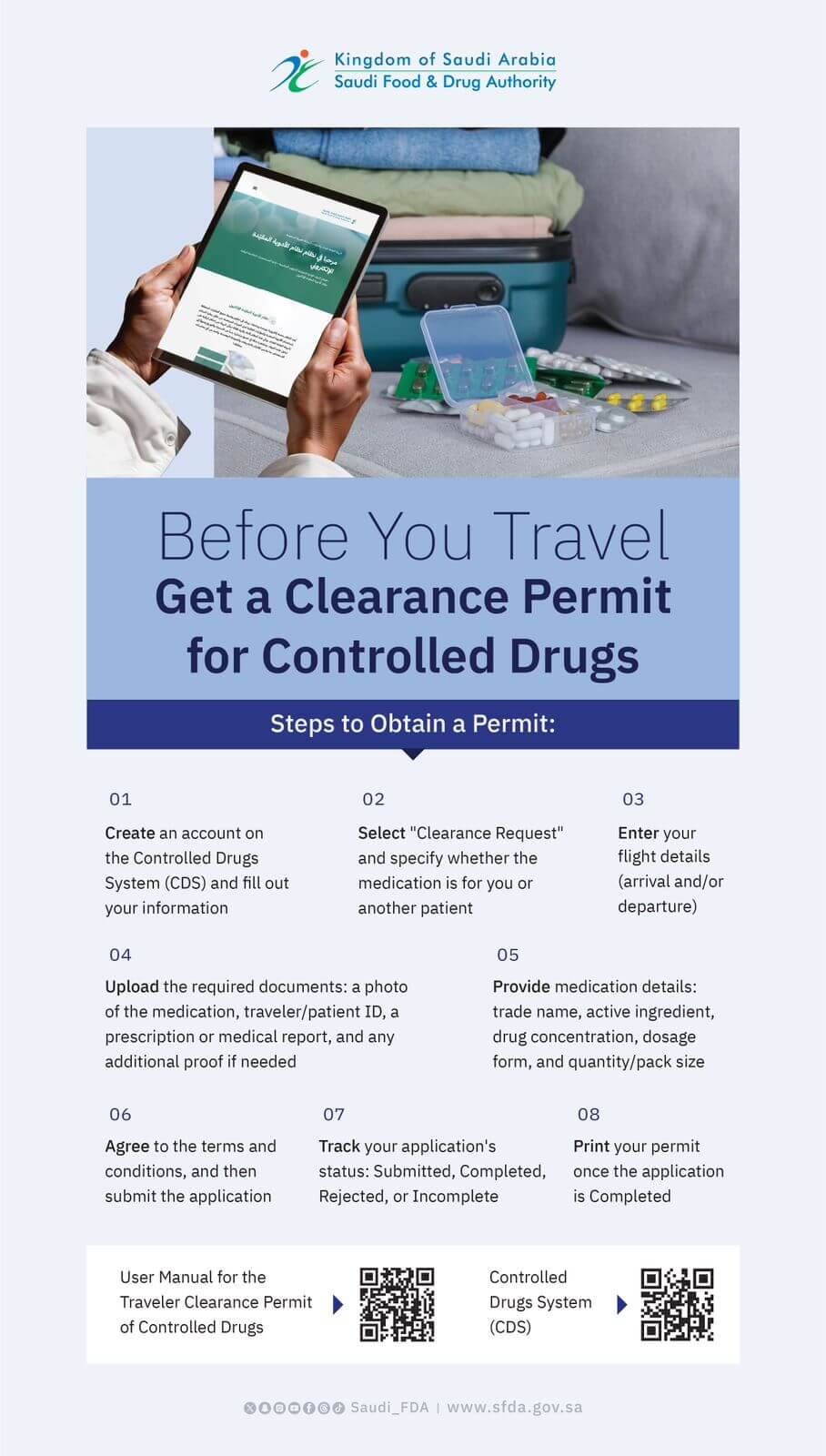 According to SFDA, all information related to permits is available through its Controlled Drugs System (CDS) at https://cds.sfda.gov.sa. Travelers can apply online by creating a personal account, submitting an electronic clearance request with patient and trip details, and uploading required documents such as a prescription, medical report, and proof of identity.